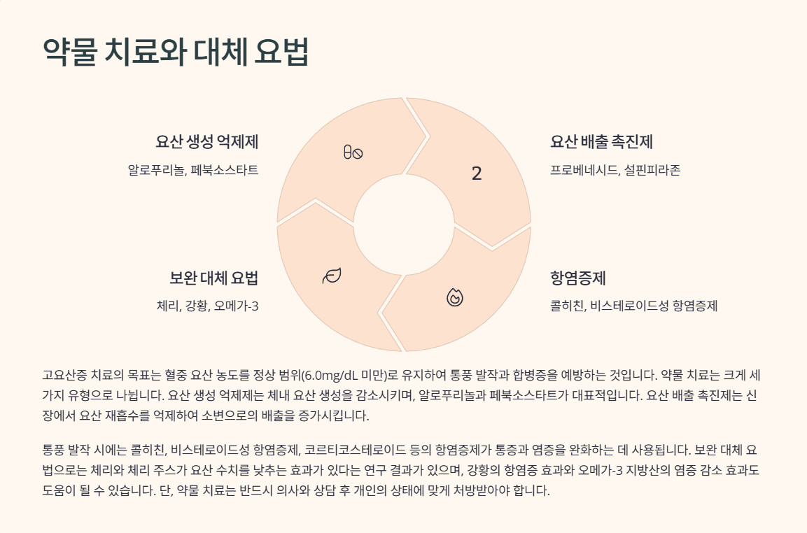 고요산증이 식이요법과 생활습관 개선만으로 조절되지 않는 경우, 약물 치료가 필요해요. 특히 요산 수치가 지속적으로 높거나 통풍 발작이 반복된다면 전문의의 판단에 따라 꾸준한 약물 복용이 권장돼요. 약물은 요산 생성을 억제하거나, 요산 배출을 촉진하는 두 가지 방식으로 나뉘어요.