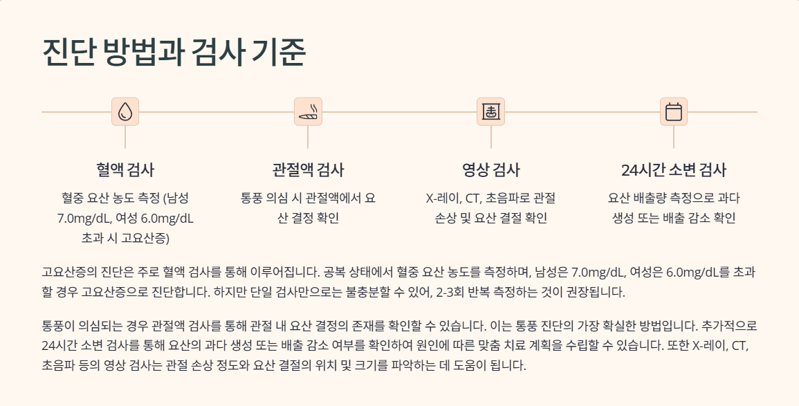 | 혈청 요산 검사 | 혈액 내 요산 수치 확인 | 진단의 기본 기준 |