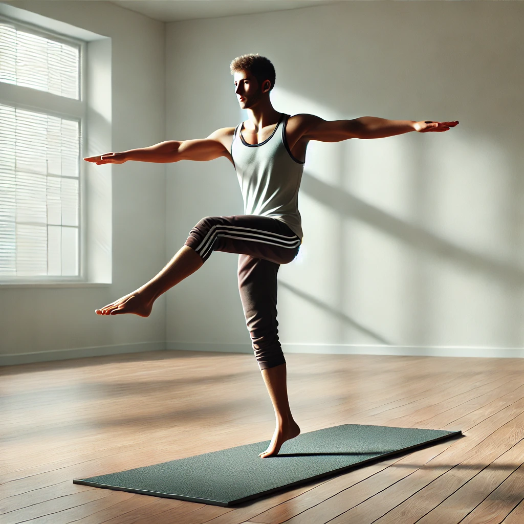 - 두 팔을 옆으로 벌려 균형을 잡은 후, 한쪽 발을 천천히 들어 올립니다.