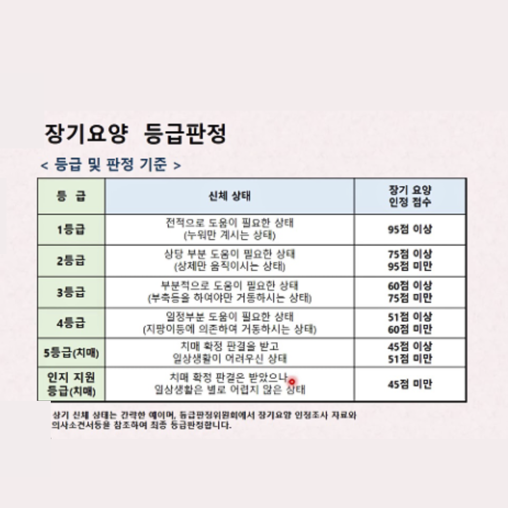 - 5등급: 신체적 기능 저하로 인해 일부 활동에서 도움이 필요하지만, 대체로 자립적인 생활이 가능한 상태입니다. 주로 인지 기능 저하로 인해 복잡한 상황에서의 판단이나 행동에 어려움을 겪으며, 이에 따른 지원이 필요합니다.