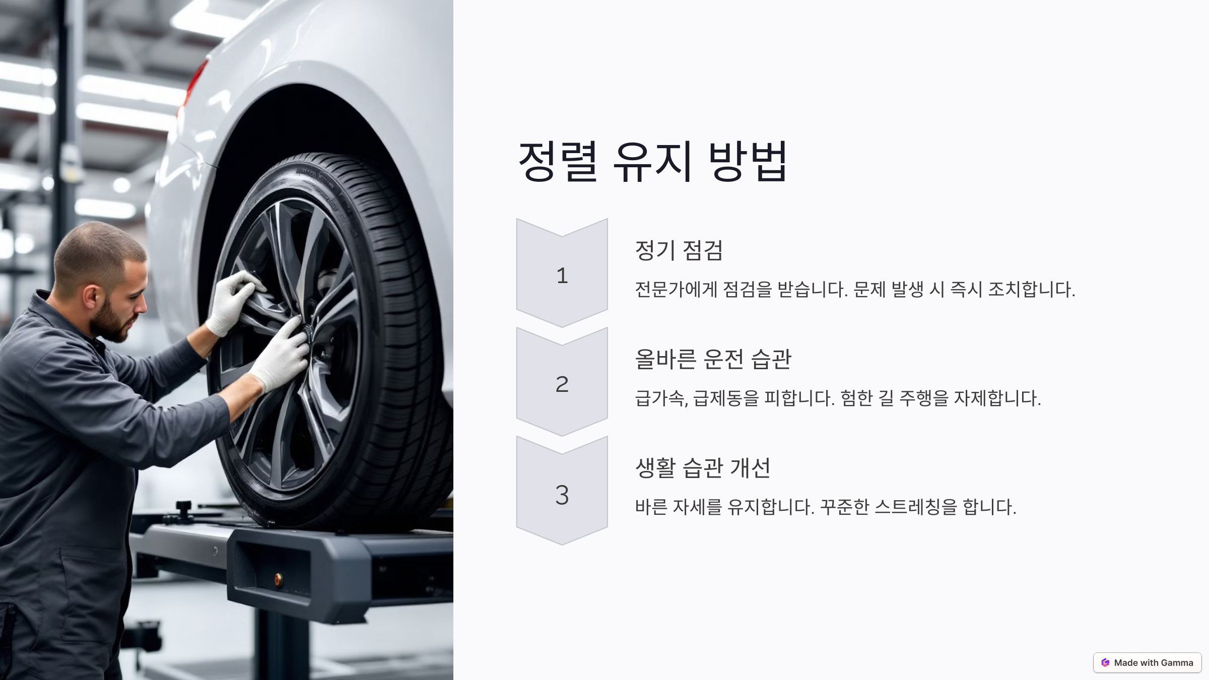 자동차의 휠 정렬이 필요하듯이, 우리 몸도 정기적인 관리가 필요해요. 그렇다면 어떻게 하면 휠 얼라이먼트와 골격 정렬을 유지할 수 있을까요? 🚗🏃♂️