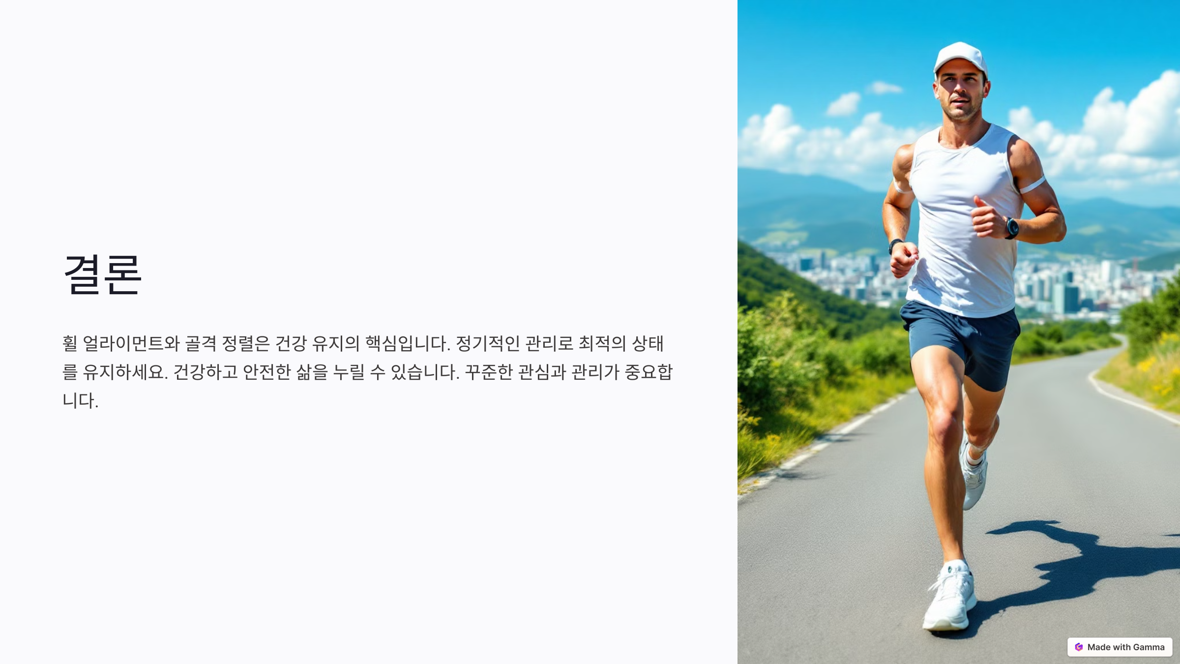 자동차의 휠 정렬을 유지하는 것처럼, 우리 몸도 바른 정렬을 유지해야 건강을 지킬 수 있어요. 다음으로는 골격 정렬을 올바르게 유지하는 방법을 알아볼까요? 🏋️♂️