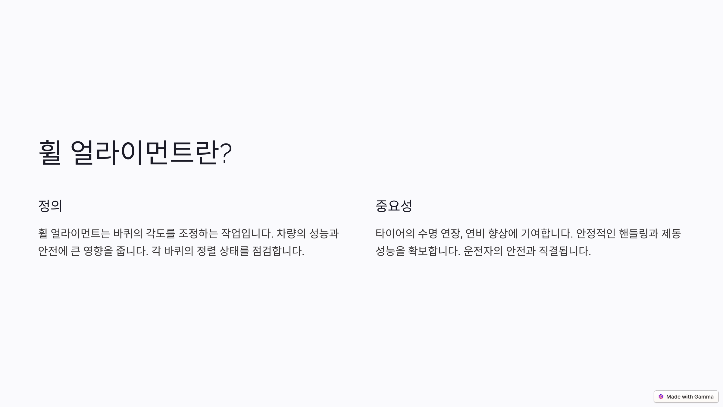 휠 얼라이먼트(Wheel Alignment)는 자동차 바퀴의 각도를 조정하여 차량이 곧고 안정적으로 주행하도록 하는 과정이에요. 차체에 비해 바퀴가 기울어져 있거나 정렬이 맞지 않으면 운전이 불안정해지고 타이어 마모도 빨라져요.