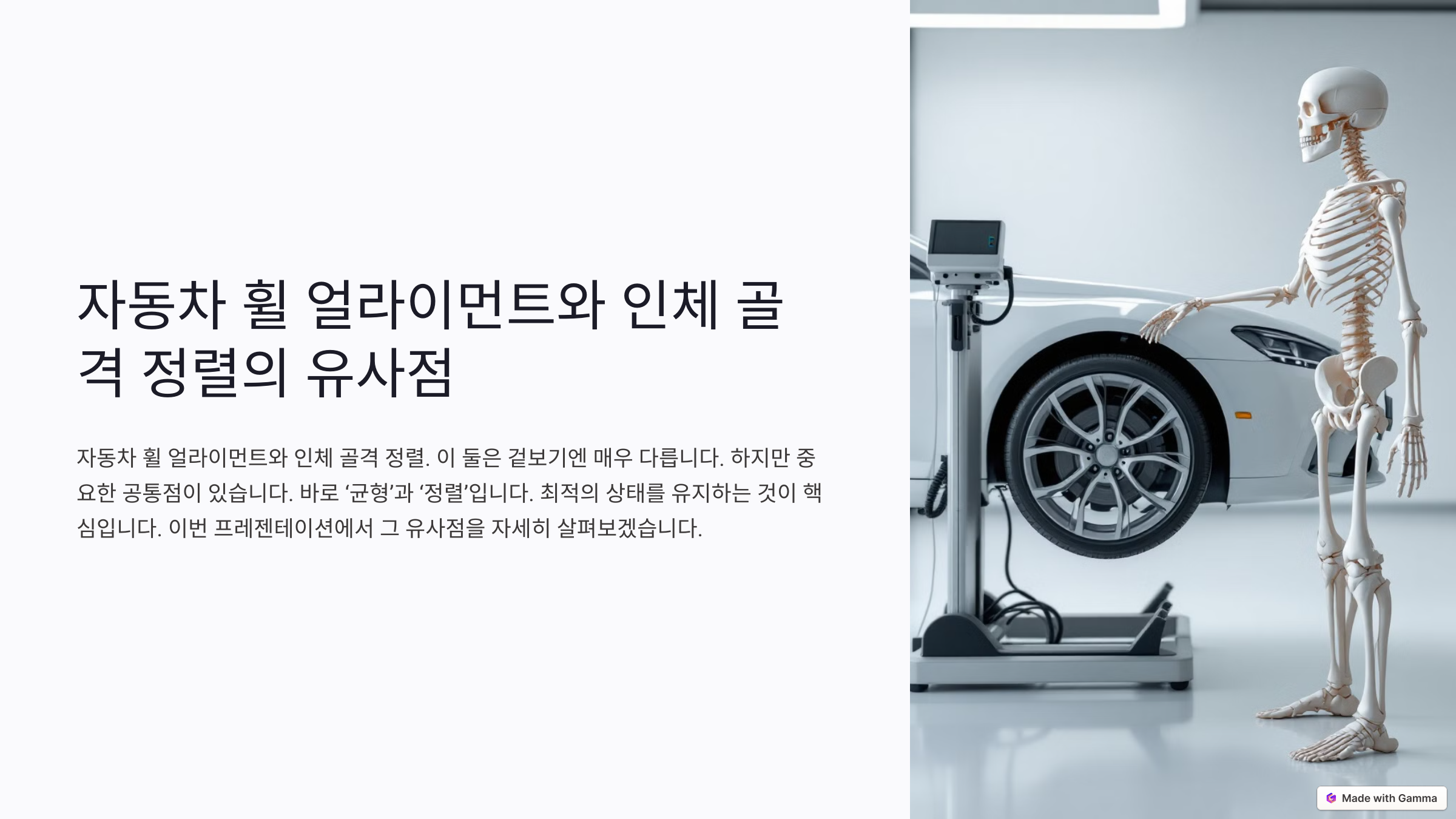 자동차의 휠 정렬과 사람의 골격 정렬, 두 가지 모두 균형이 맞아야 오래도록 건강한 상태를 유지할 수 있어요! 🚗🏃♂️