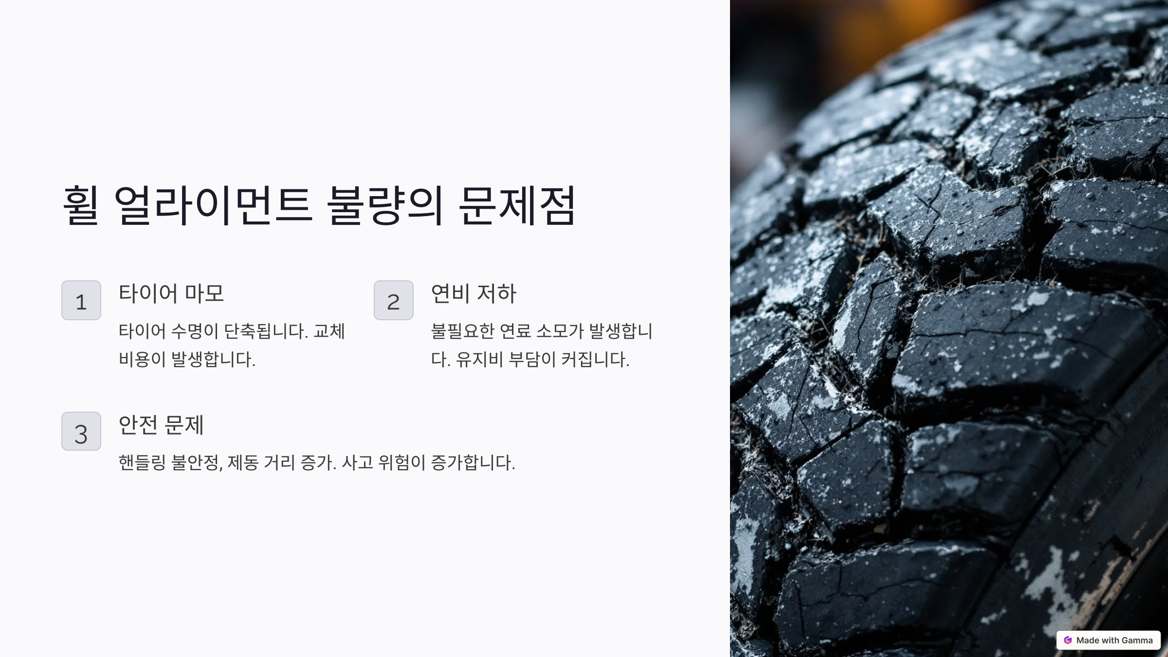 | 연비 저하 | 연료 낭비 증가 | 정확한 얼라이먼트 조정 |
