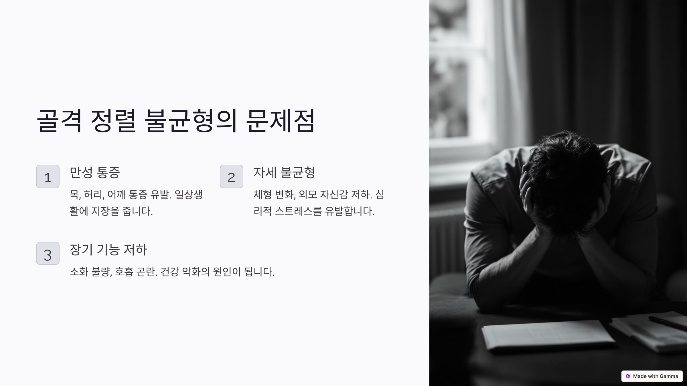 골격이 틀어지면 어깨의 높이가 달라지고, 척추가 한쪽으로 휘는 척추측만증이 발생할 수 있어요. 이는 운동 능력 저하와 만성 통증의 원인이 되죠.