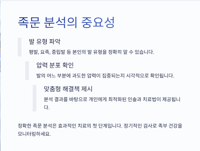 병원에서도 족부 재활을 위한 기초 검사로 족문 분석을 활용하고 있고, 스포츠 의학 분야에서도 선수들의 부상 예방과 퍼포먼스 향상을 위해 적극적으로 사용되고 있어요. 일상적인 통증에서부터 전문적인 운동 성능까지, 족문 분석은 다양한 분야에서 유용하게 활용돼요. 하지만 정형화된 제품을 사용하게 되면 오히려 나에겐 독이 될수도 있으니 구매에 신중을 기해야합니다.