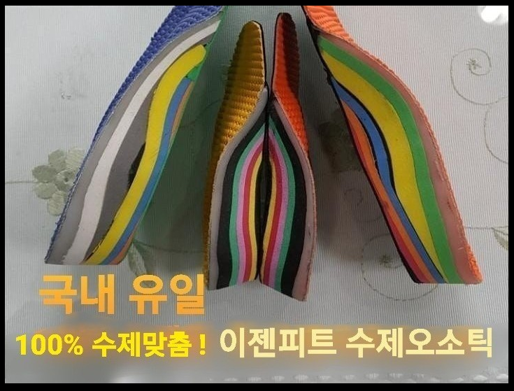 이젠피트 헬스풋 인솔은 6 겹~12겹의 소재로 구성되어 있어요. 발의 상태와 개인 맞춤으로 구성은 달라집니다. 피부에 닿는 부분은 땀 흡수가 잘 되는 재질, 중간층은 압력 분산과 지지 기능을 위한 폼소재, 하부는 강력한 구조 지지를 위한 강화 소재로 되어 있답니다. 그래서 착용감은 부드럽지만 안정성은 뛰어나요. 개인별 맞춤 제작이기에 보강(A/S)가 가능한 유일한 인솔입니다.