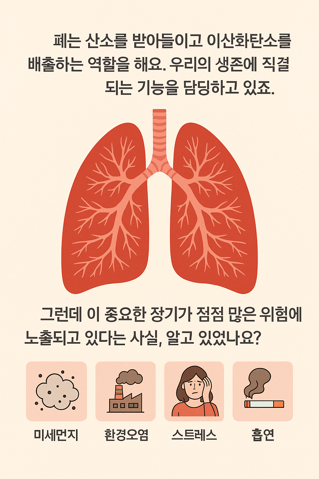 폐는 산소를 받아들이고 이산화탄소를 배출하는 역할을 해요. 우리의 생존에 직결되는 기능을 담당하고 있죠. 그런데 이 중요한 장기가 점점 많은 위험에 노출되고 있다는 사실, 알고 있었나요? 미세먼지, 환경오염, 스트레스, 흡연 등이 폐 건강을 위협하고 있어요.