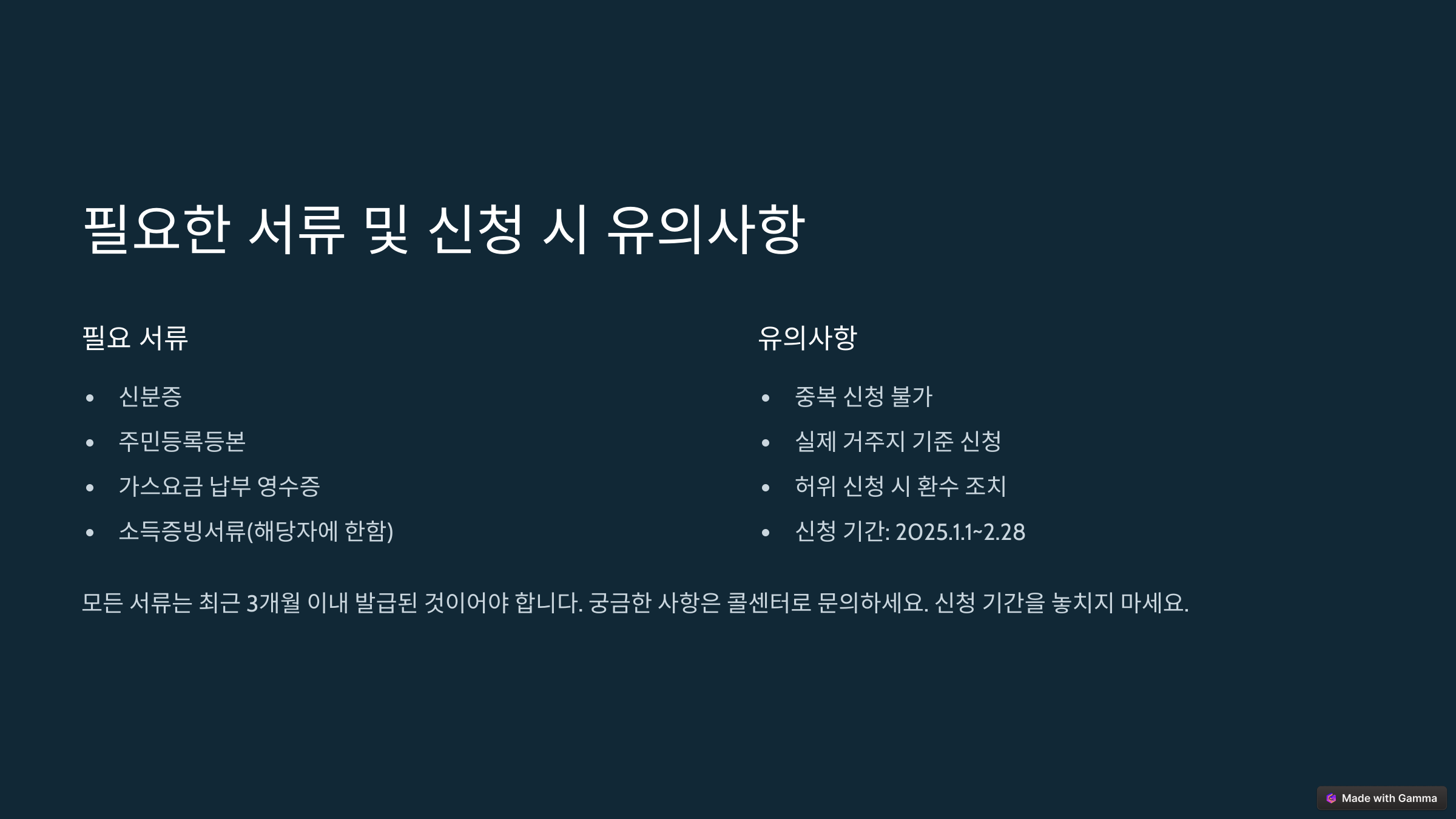 ▶ 필수 서류: 주민등록등본, 건강보험료 납부확인서, 가스요금 청구서