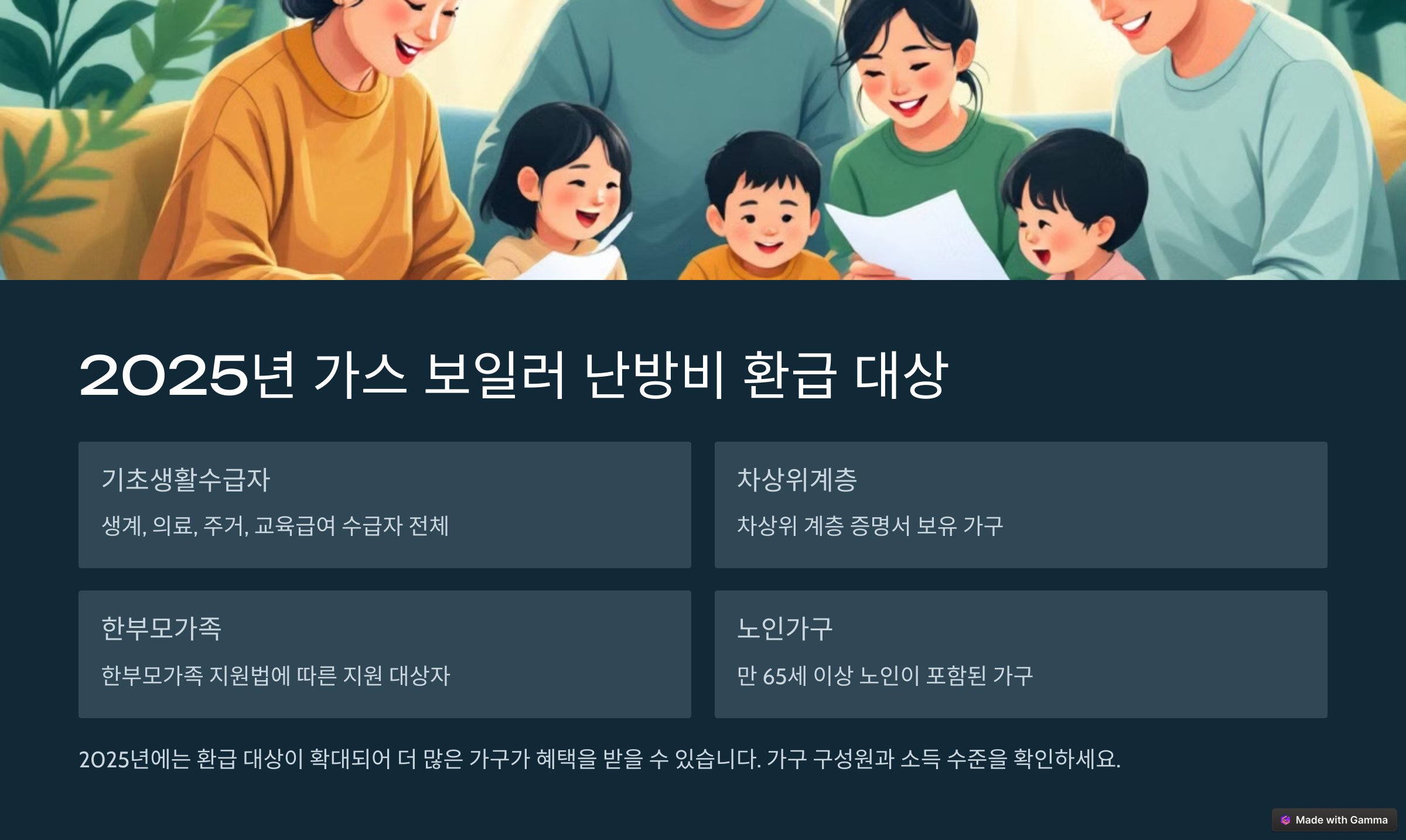 2025년 가스 보일러 난방비 환급 대상은 저소득층, 취약계층, 다자녀 가구 등 에너지 취약계층이에요. 신청 전 본인이 대상에 포함되는지 확인해 보세요! 🔎